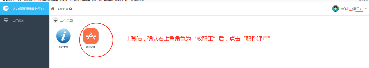 (1)个人登陆OA系统后,从校园门户-人事系统跳转,或用校园门户密码直接登陆zhicheng.cufe.edu.cn(注意:右上角角色须为“教职工”),然后点击“职称评审”;