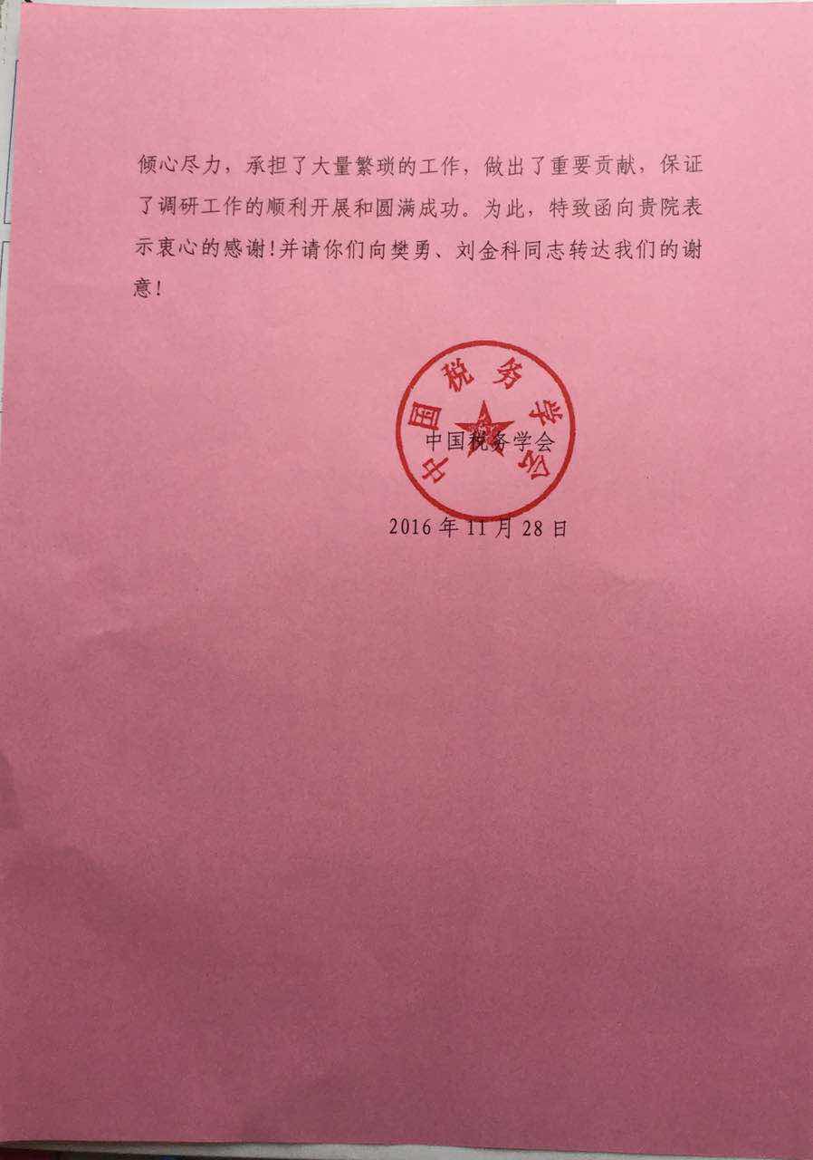 日前,中国税务学会致信感谢tyc33455cc对学会工作的大力支持,特别感谢樊勇、刘金科两位教师参与金融业营改增税负问题专项课题研究所做出的努力与贡献。学会对两位教师全程参与课题调研工作,克服困难,不辞辛苦、献计献策,承担了大量繁琐的工作,倾心尽力并做出重要贡献,给予了高度肯定。