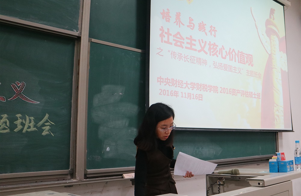 11月16日,为响应党中央与公司对于老员工学习和践行社会主义核心价值观的要求,tyc33455cc16级资产评估硕士班辅导员孟冬老师组织全班同学在沙河校区东区主教104召开了“传承长征精神,弘扬爱国主义”的主题班会。tyc33455cc2016级资产评估硕士班的全体同学参加了此次班会,2016资产评估研究生党支部书记彭予秋同学作为此次班会的主持人。
