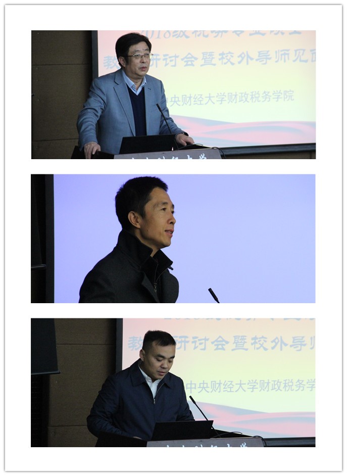 校外导师在会上纷纷发言,为中财税务专硕的培养献计献策。北京智方圆税务师事务所有限公司总裁王冬生先生,充分肯定了中财学子学术综合素质,并对同学们提出了几点建议,第一是提高写作能力,第二是提高哲学水平,要善于辩证思维。北京鑫税广通税务师事务所有限公司董事长王进先生指出,2019-2020年国家将要建立1000家税务师事务所与高校的校企实习基地,希望能继续与中财税务专业加强合作。德勤会计师事务所合伙人宫滨先生在会上对同学们提出几点希望,一是在学习过程中多去关注思路与方法,多去接触税务的方方面面。二是把握好两年的时间,积极参与学习、实践、实习等,一定要锻炼同时处理多个任务的能力,三是时刻注重对自己的管理,无论毕业后走向哪里,都要接受社会的考验。北京市国税局第二稽查局孔丹阳副局长也对同学们提出几点建议:一要注重课程学习;二要多学科融合学习,努力成为复合型人才。尤尼泰税务师事务所董事局主席刘志忠先生提出,税务行业用自己的智慧做出贡献,同学们毕业后进入这个行业将会在工作中不断提升自己的能力,获得更好地发展。普华永道会计师事务所合伙人钱江涛先生认为,不管以后从事什么行业,最重要的是对个人能力的培养,用自我驱动力去学习了解更多的东西。德勤会计师事务所税务经理李权周先生以自己在税务局工作的经历与同学们共勉,表示将继续为同学们的实习实践提供机会。德勤会计师事务所税务经理嵇峰先生用自己的亲身经历描绘了从事税务行业的苦与乐,建议同学们根据自己的兴趣在税务服务里选择最适合自己的领域。乾元中利国际税务咨询(北京)有限公司副总经理燕东先生认为,大家在公司除了学习工作外要思考的东西,多涉猎,多思考。华夏幸福基业股份有限公司财务部负责人许军先生从职业发展的角度跟同学们交流了上市公司和社会需要什么样的人才,希望同学们能学有所用。