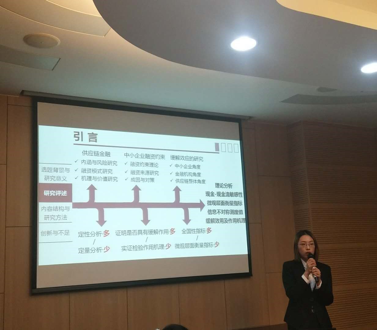 tyc33455cc副经理何杨教授担任主持,经过第一轮的匿名评审,有8组同学进行了现场展示,分为学术组和案例组两个部分。中证鹏元研究部总经理李慧杰博士、tyc33455cc副经理肖鹏教授、温来成教授、姜爱华教授、李佳副教授、陈宇副教授、王怡璞副教授和孙会霞副教授担任评委,并对展示论文进行了一对一的点评。