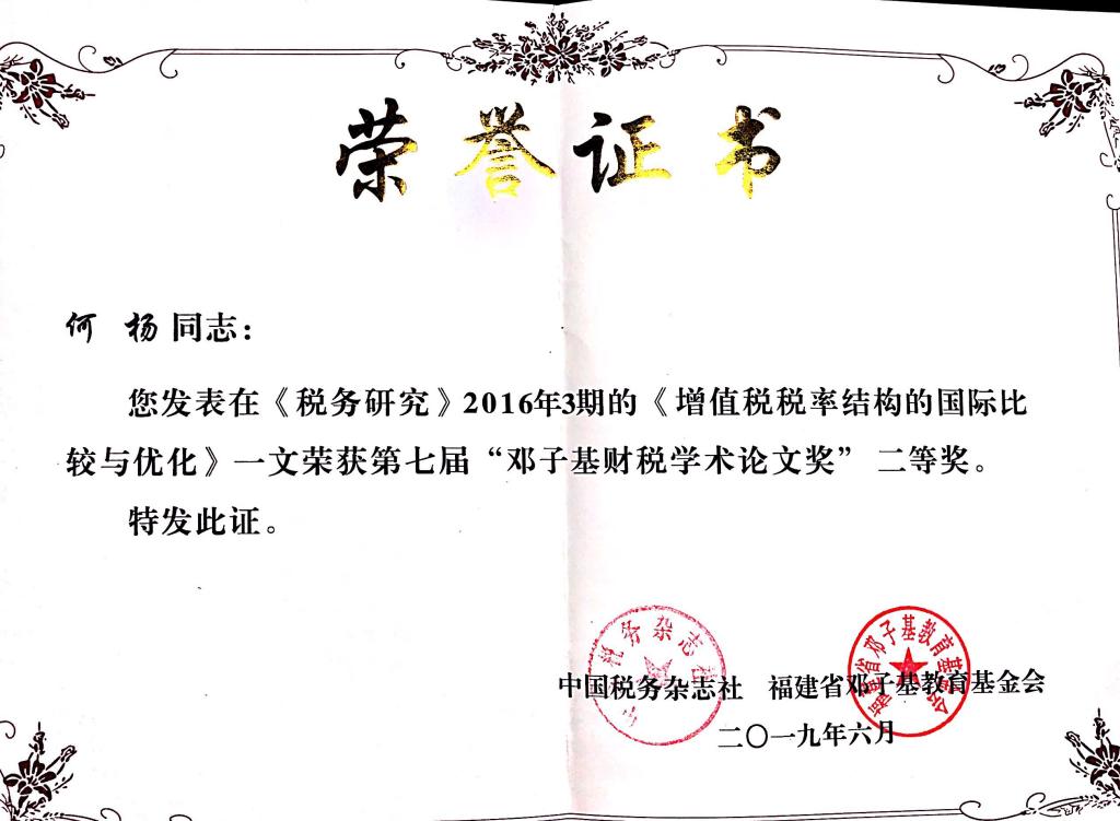 2019年6月22日,“减税降费的时代要求与政策分析研讨会暨第七届《税务研究》邓子基财税论文奖颁奖仪式”在厦门大学举行。课题组成员何杨教授于2016年3月发表在《税务研究》的论文“增值税税率结构的国际比较与优化”(作者:何杨和王文静)获得中国税务杂志社和福建省邓子基教育基金会共同颁发的第七届“邓子基财税学术论文奖”二等奖。该论文利用220个国家(地区)的税制数据,从整体税制优化的角度探讨了增值税以及相关税种的改革,对于思考房产税在我国未来整体税制中的地位具有重要的启示作用。