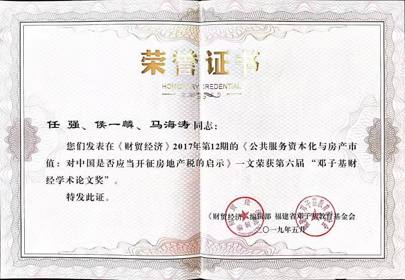 2019年6月29日,《新中国成立七十周年财政金融协同创新理论研讨会》及“2019年度《财贸经济》邓子基财经学术论文奖颁奖仪式”在京举行。课题组成员发表在《财贸经济》2017年第12期的论文“公共服务资本化与房产市值:对中国是否应当开征房地产税的启示”(作者:任强、侯一麟和马海涛)获得《财贸经济》编辑部和福建省邓子基教育基金会共同评选、颁发的2019年度“邓子基财经学术论文奖”。