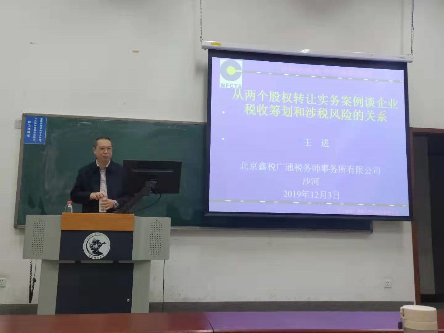2019年12月3日晚17:50,沙河校区东区主教213举办了财税公司2019税务专硕第55期案例研讨课,主讲人王进老师,tyc33455cc杨龙见老师进行主持。