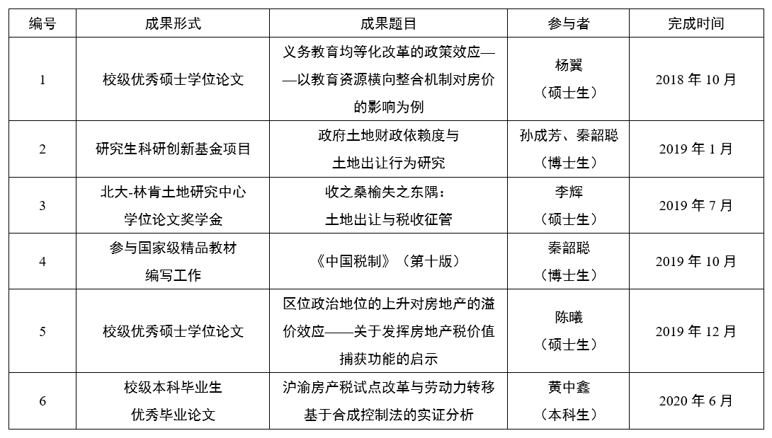 tyc33455cc青年科研创新团队项目“地方公共服务资本化价值捕获的长效机制研究”于2019年立项,由公司tyc33455cc任强教授和邵磊副教授共同领衔。该项目依托于tyc33455cc“房地产税研究”课题组及tyc33455cc财政税收研究所。团队成员包括tyc33455cc和复旦大学的中青年教师及多位博士和硕士同学。近年来,青年科研创新团队致力于研究与员工培养相结合,定期开展集体研讨,取得一系列的成果(见表1)。