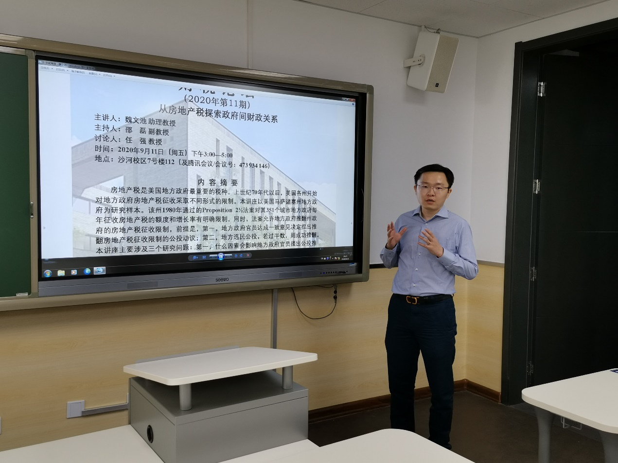 魏文池老师介绍了他最近在Public Administration Review期刊发表的两篇论文:Municipal Structure Matters: Evidence from Government Fiscal Performance和State Fiscal Constraints and Local Responses: Evidence from the Property Tax Limit Overrides in Massachusetts。魏老师认为充分理解美国市政结构及其对地方政府房地产税征收的限制措施,对研究未来中国的房地产税政策有一定的借鉴意义。魏老师将利维坦理论、中位选民理论和议程设定理论等理论方法与实证方法相结合,深入浅出地讲述了美国影响基层推翻房地产税限制的因素,以及推翻限制造成的影响。魏老师讲座结束后,与“线上”“线下”的老师同学进行了互动,解答了大家的疑问。随后任强老师讨论了这两篇文章,并提出了一些问题和思考。这次讲座为研究房地产税以及政府间财政关系问题带来了很多启发。