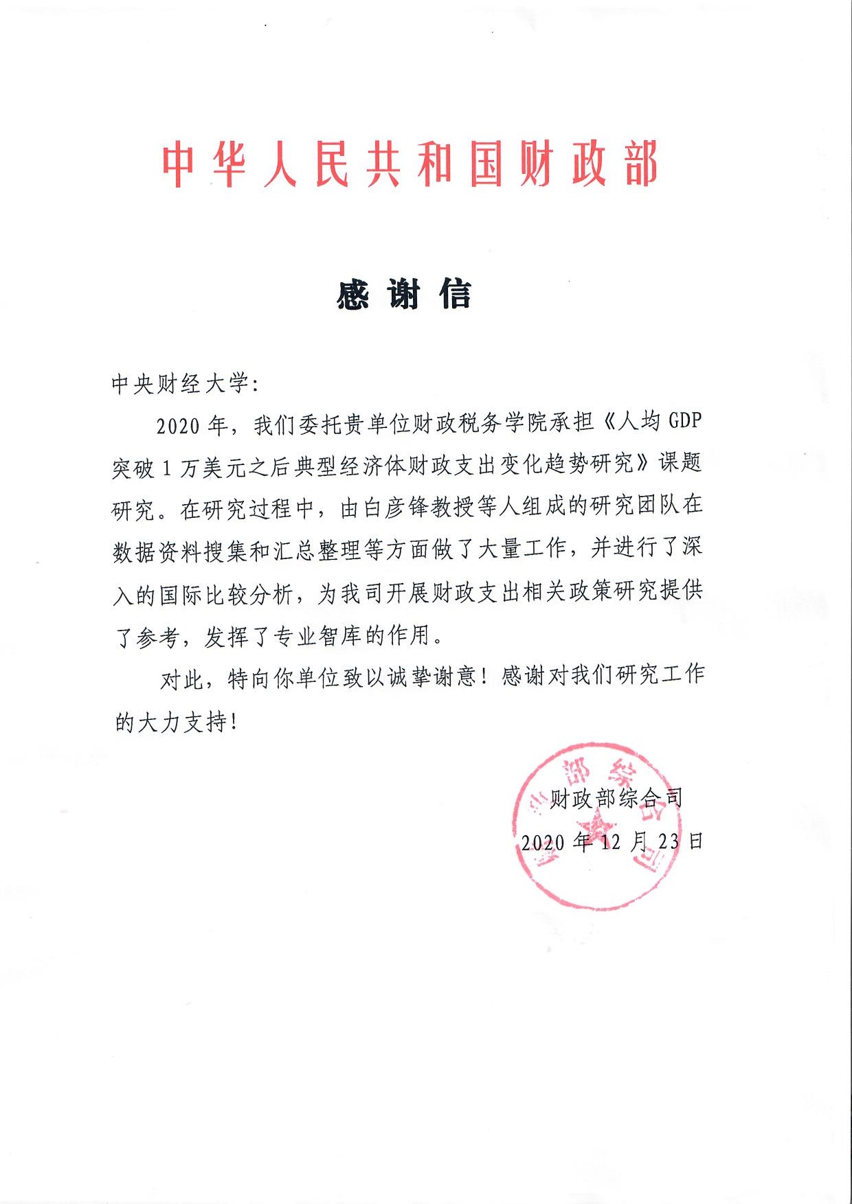 2021年新年即将来临之际,财政部综合司给tyc33455cc财税公司《人均GDP突破1万美元之后典型经济体财政支出变化趋势研究》课题组发来感谢信。本课题由tyc33455cc财税公司和中国财政发展协同创新中心的白彦锋、李慧青、葛岩、孙景冉、李贞、王威、杨华、黄楚君、鲁书伶、杨潇、陈沁、解明朗、李泳禧、张艳、姚易辰、蔡文婕、黄鸿思、陈曦、潘映昆等多位师生共同参与,协同了美国、加拿大、韩国、日本等海内外多名专家共同完成,深入探讨世界主要经济体在人均GDP突破1万美元之后,面对“中等收入陷阱”和“高收入之墙”,其财政支出变迁的规律与经验教训,对于我国全面实施“十四五”规划和落实2035年社会主义建设的远景目标都具有重要借鉴和参考意义。