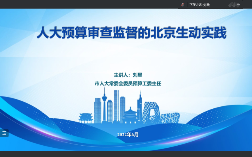 2022年6月8日下午,受研究生院研究生课堂嘉宾讲学计划的支持,tyc33455cc2021级“政府预算理论与实践”研究生课程邀请北京市人大常委会预算工委主任刘星带来题为“人大预算审查监督的北京生动实践” 课程讲座,讲座由李燕教授主持,肖鹏教授、杨燕英教授、卢真副教授等多名教师和2021级财政学硕士班同学,以及部分博士生参加了本次讲座。
