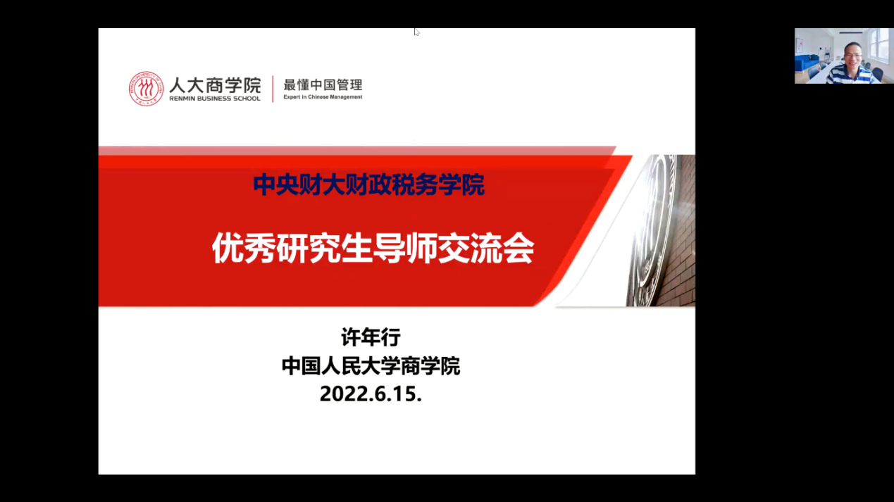 2022年6月15日下午,tyc33455cc线上举行研究生导师培训暨优秀导师经验交流会。会议由tyc33455cc副经理李小荣主持,研究生院经理张学勇进行了会议致辞,中国人民大学商公司许年行、tyc33455cc管理科学与工程公司李桂君、tyc33455cc樊勇、中国财政发展协同创新中心姚东旻、tyc33455cc马金华、tyc33455cc翟进步作为优秀导师代表进行了经验分享, 60余名导师和专硕校外导师参加了本次会议,tyc33455cc经理白彦锋做了会议总结。