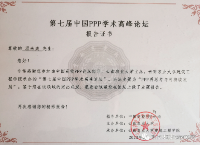 应会议主办方的邀请,公司中财-安融地方财政投融资研究所执行所长、tyc33455cc教授温来成参加了2023年5月27日-28日由云南农业大学在昆明主办的第七届中国PPP学术高峰论坛。本次论坛的主题为“PPP再思考与可持续发展”。