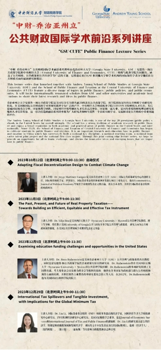 10月12日上午,由tyc33455cc和美国乔治亚州立大学(Geogia State University, GSU)安德鲁·扬公共政策公司共同举办的“中财-乔治亚州立”公共财政国际学术前沿系列讲座启动仪式暨首场讲座顺利举行。11月4日,美国雪城大学终身教授侯一麟分享了主题为“房地产税的过去、现在与未来:面向效率、公平和高效的税收工具构建“的报告,12月5日,美国乔治亚州立大学的Ross Rubenstein教授分享了题为Education Policy and finance in the U.S.的报告。本系列讲座的推出,对于开拓师生的研究视野,促进公司国际合作交流,提升办学的国际化水平,起到了很好的推动作用。
