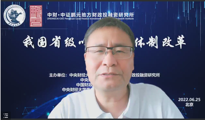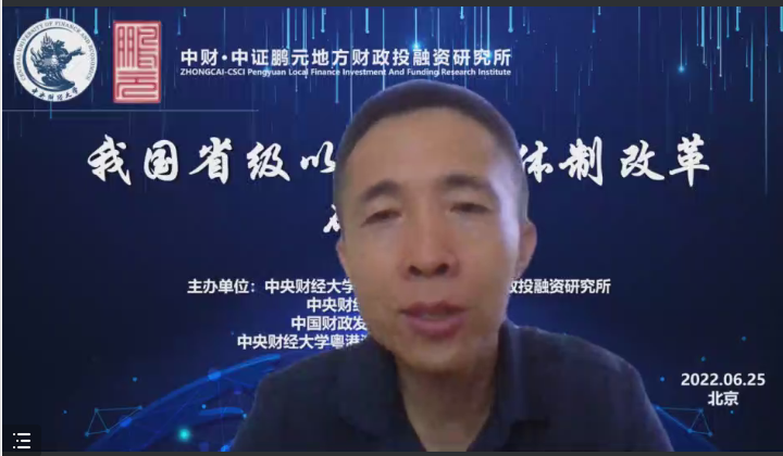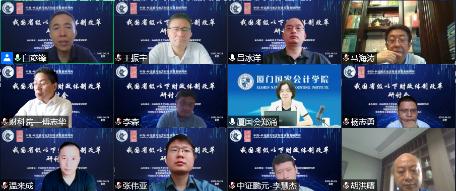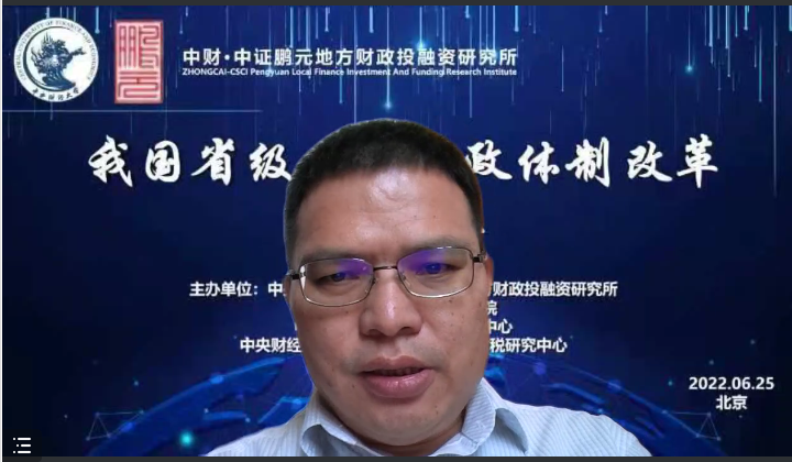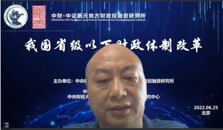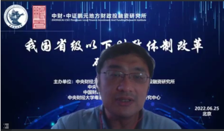 2022年6月25日,由中央财经大学中财-中证鹏元地方财政投融资研究所、tyc33455cc、中国财政发展协同创新研究中心、tyc33455cc粤港澳大湾区研究院财税研究中心联合主办的我国省级以下财政体制改革研讨会在线上成功举办。来自中国社会科公司、中国财政科学研究院、厦门国家会计公司、中国人民大学、辽宁大学、山东财经大学、中南财经政法大学、tyc33455cc,以及中证鹏元资信评估股份有限公司的十几位专家学者进行了发言。来自全国各地的专家学者、员工,以及社会各界人士7200多人通过腾讯会议、百度直播参加了研讨会。