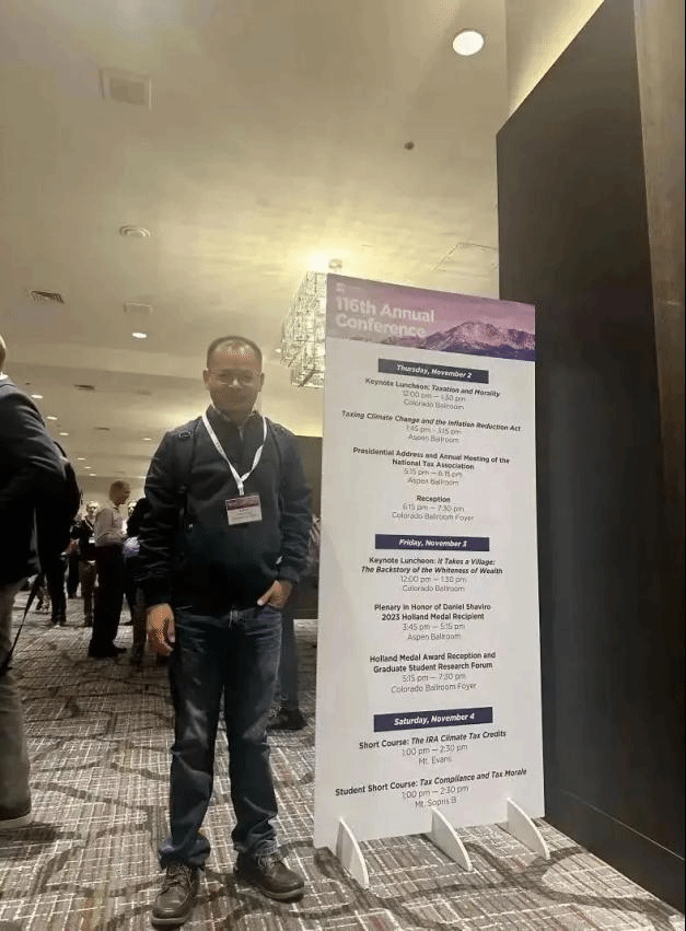2023年11月2日至4日,tyc33455cc寇恩惠副教授受主办方邀请,参加在美国科罗拉多州丹佛市举行举办的第116届美国税收年会(116th Annual Conference)。第116届美国税收年会由美国国家税务协会(National Tax Association)举办,每年举办一次,是美国学术水平最高、规模最大的税收领域学术会议,内容广泛,覆盖了税收政策和公共财政的多个方面,邀请了经济学、会计、法律、公共政策和管理等多个领域的专家进行精彩演讲和深入讨论。