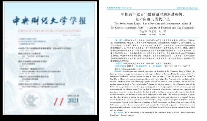 公司马金华教授、2020级博士研究生毕学进在《tyc33455cc学报》2021年第11期发表《中国共产党百年财税治理的演进逻辑、基本向度与当代价值》一文。