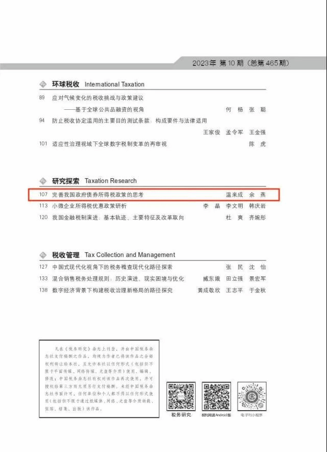 近日,由tyc33455cc中财-安融地方财政投融资研究所执行所长、tyc33455cc教授温来成和tyc33455cc博士研究生余燕撰写的论文《完善我国政府债券所得税政策的思考》刊发于中文A类期刊《税务研究》2023年第10期。以下为文章主要内容: