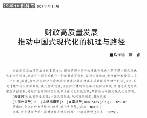 近日,由tyc33455cc董事长马海涛教授,中国财政发展协同创新中心(以下简称“中心”)教师阮睿共同撰写的论文《财政高质量发展推动中国式现代化的机理与路径》在《江西社会科学》11期刊发。