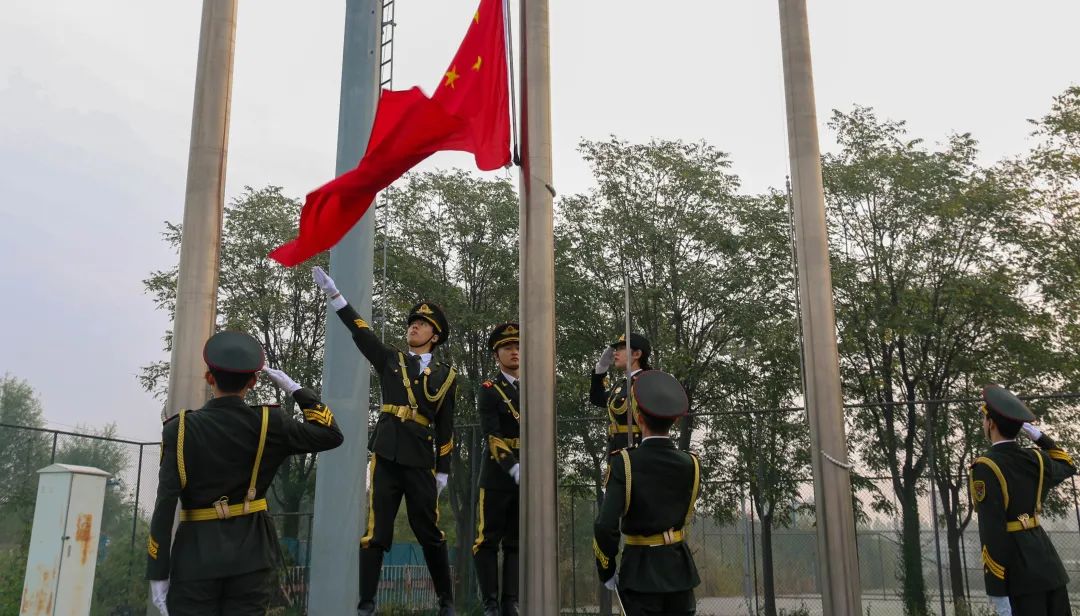 在肃穆的口号声中,国旗护卫队迈着整齐划一的步伐护送国旗走向升旗台。伴随着雄壮的《义勇军进行曲》,五星红旗冉冉升起。师生们肃立致敬,齐唱国歌,表达对祖国最真挚的祝福。
