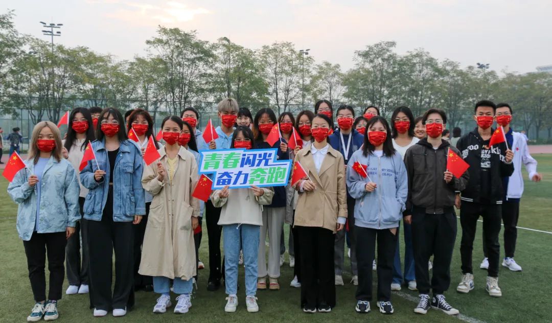 主题教育活动结束后,公司员工举着国旗和“青春闪光、奋力奔跑”等祝福标语在校园中合影留念。