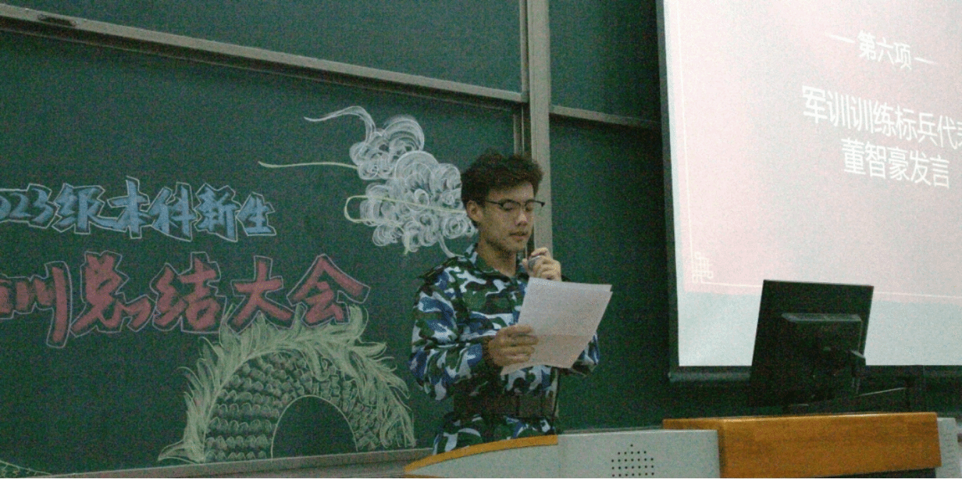训练标兵代表董智豪首先感谢了教官和老师,正是他们的严格要求,磨砺了同学们的意志,使优良作风得以发扬。同时,他鼓励在座的青年挥洒下热血、泪水与汗水,把军训培养起来的组织纪律观念、团结协作精神发扬光大,并祝愿同学们未来能够无所畏惧地向前迈进。