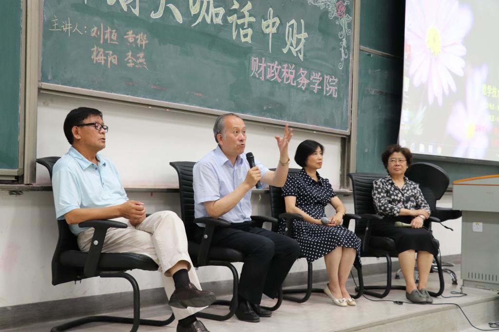 首先为同学们进行讲座的是刘桓教授。刘教授表示,作为财税公司的员工,首先要清楚自己应具备的个人素质,并且对自己未来的成长有所思考。刘教授针对新生同学提出了四点应具备的素质:对数字敏感、对社会时事敏感、广泛培养兴趣、拥有强健的体魄。同时刘教授希望,同学们在大学四年中做到四个“1”:拥有1个专长、结交10个好友、读100本好书以及每天跑步1000米。接下来登台的是梅阳教授。梅教授回顾了自己经历的中财39年发展,以自己的求学时光与当今对比,向同学们展示了中财的飞速发展。梅教授提醒同学们一定要注意学科互补,文理兼修,在如今跨界的大趋势下赶上潮流。然后与大家分享的,是黄桦教授。黄教授表示,既然选择了财税专业,就一定要开阔自己的眼界与胸怀,注意中国及世界的变化。同时,除了必须的技术手段之外,同学们更应重视基本理论的学习。最后,黄教授深情地表示,同学们应具有专业情怀,热爱自己的专业。最后登场的,是李燕教授。李教授提到,在刚进入大学的这段时间里,同学们要迅速完成“转型”,及时转变自己的心态和学习状态。这对于大学的学习将事半功倍。四位教授发完言后,讲座来到了同学提问环节。同学们反应热烈,针对同学们提出的“老员工如何将课程与实践更好的结合”、“读书方式的选择”、“大学课程的取舍”等问题,四位教授进行了耐心、细致的解答,帮助同学们切实地解决了问题。