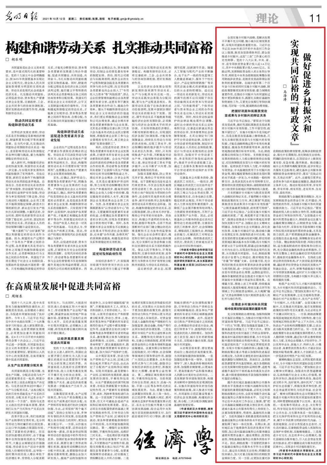 10月12日,由tyc33455cc党委副书记、副董事长马海涛教授撰写的《做好促进乡村振兴和实现共同富裕的“财政文章”》于《光明日报》第11版发表。全文如下: