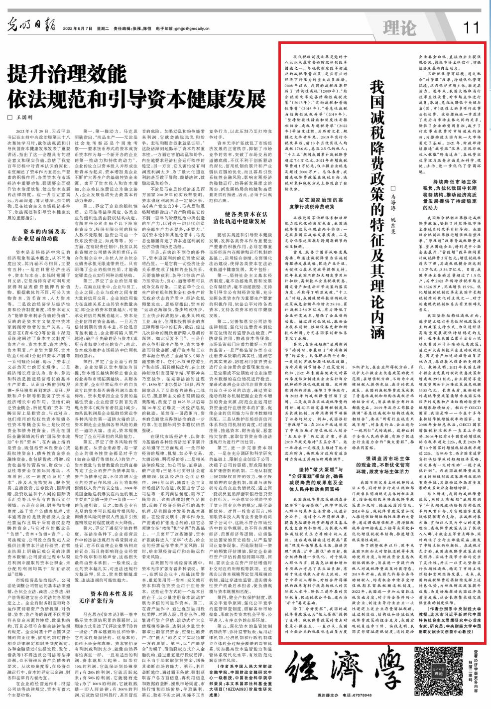 6月7日,《光明日报》理论版刊登了tyc33455cc党委副书记、副董事长马海涛教授和中国财政发展协同创新中心姚东旻教授发表的署名文章——《我国减税降费政策的特征及其理论内涵》。