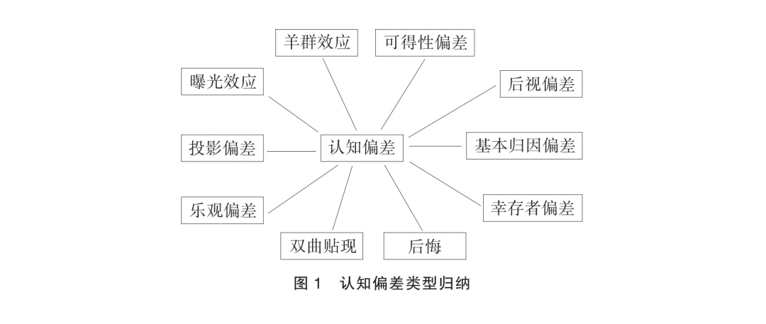 个人认知偏差的案例在现实生活中十分常见,可简要归纳为图1中的10种常见情况。曝光效应指人们会更加偏好自己熟悉的事物,这是互联网平台能够通过“大数据杀熟”获取不正当收益的心理学理论基础,也是国家强调对互联网产业加强监管的理论基础;羊群效应指个人通常具有随波逐流的倾向,这也是时尚潮流能够盛行的原因;可得性偏差指人们往往根据自己所获得的部分信息做判断,无法从更为客观的视角进行选择;后视偏差指人们会在事情发生后认为自己在之前已经预先得知结果,日常生活中被称为“马后炮”;基本归因偏差也是人们在信息获得不完全的情况下通常所产生的一种局限性思维定式;幸存者偏差更接近于一种逻辑谬误下所产生的错误认知;后悔也是较为常见的心理偏差,指在个人已知某项错误的决策会带来损失时,仍然进行选择,就会产生后悔的情绪,但当其作为一项选择的沉没成本时,后悔的情绪就是没有必要的;双曲贴现指相较于日后获得更多报酬,现实中的个人有时仍然倾向于选择眼下的利益;乐观偏差则类似于过度自信的心理状态;投影偏差则是一种错误预知未来效用的倾向。