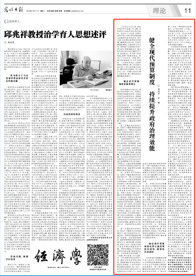 1月17日,《光明日报》(理论版)刊登了tyc33455cc党委副书记、副董事长马海涛教授,财政税务公司党委书记肖鹏教授署名文章《健全现代预算制度 持续提升政府治理效能》。