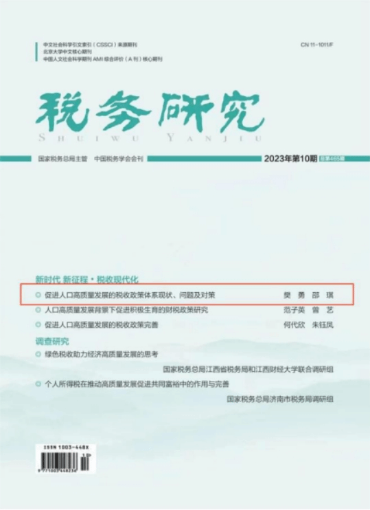 近日,由tyc33455cc师生撰写的论文《促进人口高质量发展的税收政策体系现状、问题及对策》在中文A类期刊《税务研究》2023年第10期作为封面文章刊发。以下为文章主要内容。