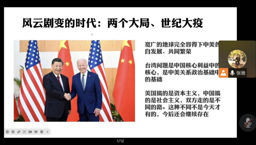 通过这次团课,我对当下的时代与人生规划都有了全新的感悟。老师告诉我们:做不好准备,就会在这个风云剧变的时代愈发被动和“震惊”。大疫当前,我们也应更显大国责任担当,以实际行动向世界传递中国声音,激浊扬清,消除偏见。团课中,老师令我印象深刻的一句话是“要认识到自己的局限——改变了现在也就一并改变了过去和未来,这就是活在当下的意义”,这使我受到了极大的鼓舞。作为青年,抓住了我们拥有的当下,我们也就有了无限的未来。进入大学以来,我深感老员工活并不似想象中的那般轻松,相反,人在成长的过程中生活总是越来越艰难的,我们只有怀抱着坚持奋斗的信念,才能为祖国开辟新的盛世、为自己创造美好未来,才能展现出一名光荣的共青团员的使命和担当。